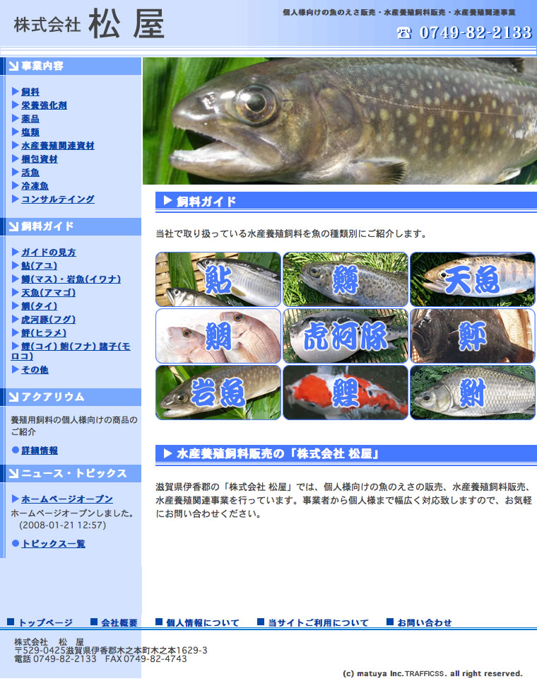 ![]() 画像を拡大する | ホームページ紹介滋賀県伊香郡の「株式会社 松屋」では、個人様向けの魚のえさの販売、水産養殖飼料販売、水産養殖関連事業を行っています。事業者から個人様まで幅広く対応致しますので、お気軽にお問い合わせください。 (株)松屋 |