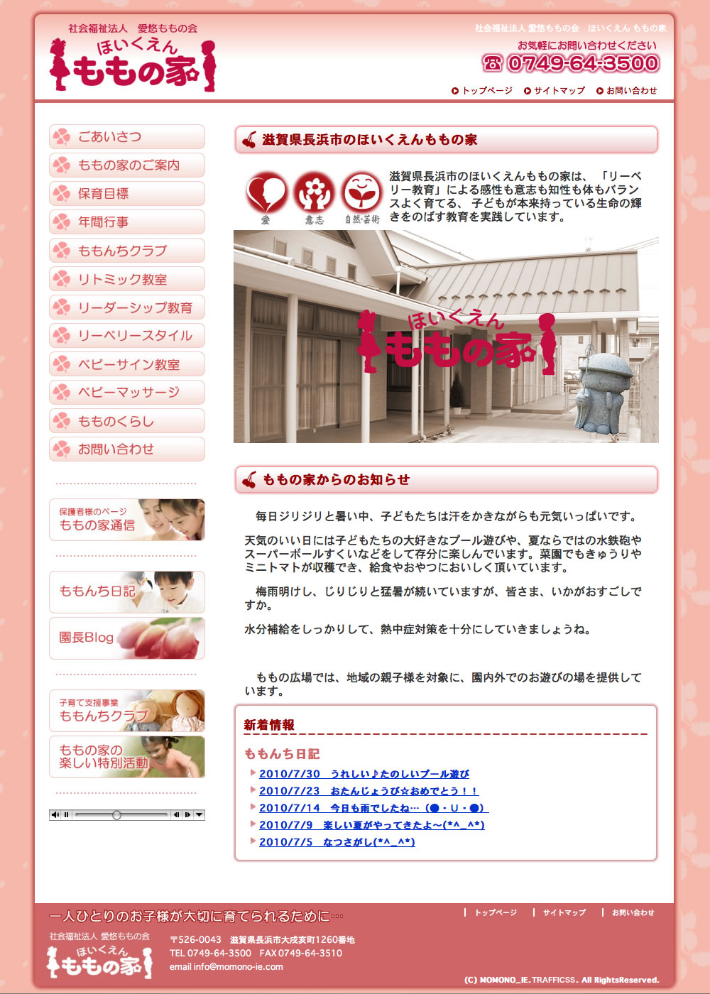 制作のポイント以前からあるホームページを全面リニューアルして制作しました。以前のホームページのイメージを崩さないようにデザインのリニューアルを行い、使いやすさを重視したホームページです。また、情報を発信する為の外部ブログのセッティングを行い、トップページに表示するようにしました。また、ご家族のみがご覧頂けるフォトアルバムも設置しています。 | |