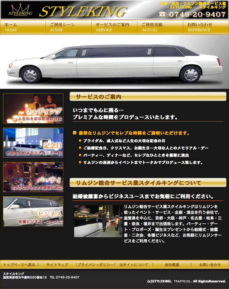 ![]() 画像を拡大する | ホームページ紹介リムジン総合サービス業スタイルキングはリムジンを使ったイベント・サービス・企画・演出を行う会社で、滋賀県を中心に、京都・大阪・神戸・名古屋・岐阜・三重・奈良・福井まで出張致します。パーティー・デート・プロポーズ・誕生日プレゼントから結婚式・披露宴・二次会、各種ビジネスなど、お気軽にリムジンサービスをご利用ください。 スタイルキング |