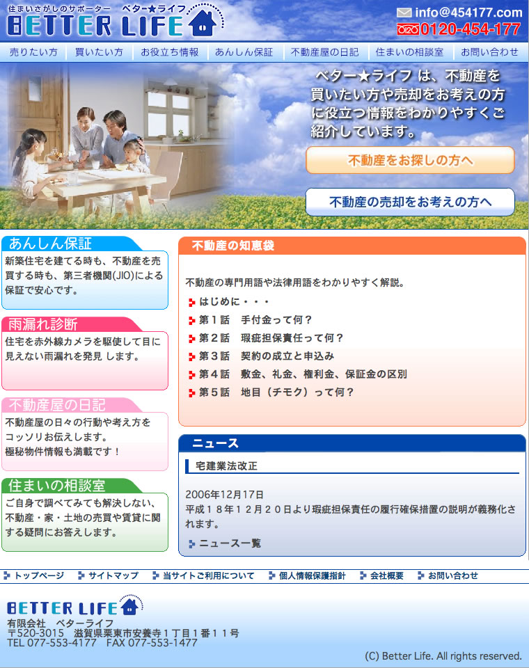 ![]() 画像を拡大する | ホームページ紹介滋賀県の不動産業ベターライフは、京都と滋賀の不動産・土地の売買や仲介、分譲一戸建て住宅の販売、不動産売買に役立つ情報を掲載しています。また、不動産探しに役立つ不動産情報誌を無料でプレゼントしています。 (有)ベターライフ |