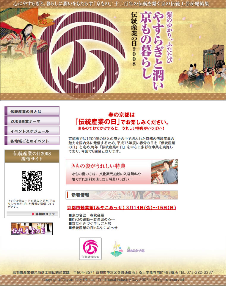 ![]() 画像を拡大する | ホームページ紹介京都市では1200年の悠久の歴史の中で培われた京都の伝統産業の 魅力を国内外に発信するため, 平成13年度に春分の日を「伝統産業の日」と定め, 毎年「伝統産業の日」を中心に多彩な事業を実施しており, 今回で7回目となります。 京都伝統産業の日2009 |