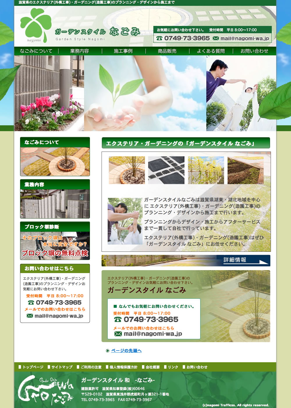 ![]() 画像を拡大する | ホームページ紹介ガーデンスタイルなごみは滋賀県湖東・湖北地域を中心にエクステリア(外構工事)・ガーデニング(造園工事)のプランニング・デザインから施工まで行います。プランニングからデザイン・施工からアフターサービスまで一貫して自社で行っています。エクステリア(外構工事)・ガーデニング(造園工事)はぜひ「ガーデンスタイル なごみ」にお任せください。 外構工事・造園工事 ガーデンスタイルなごみ |